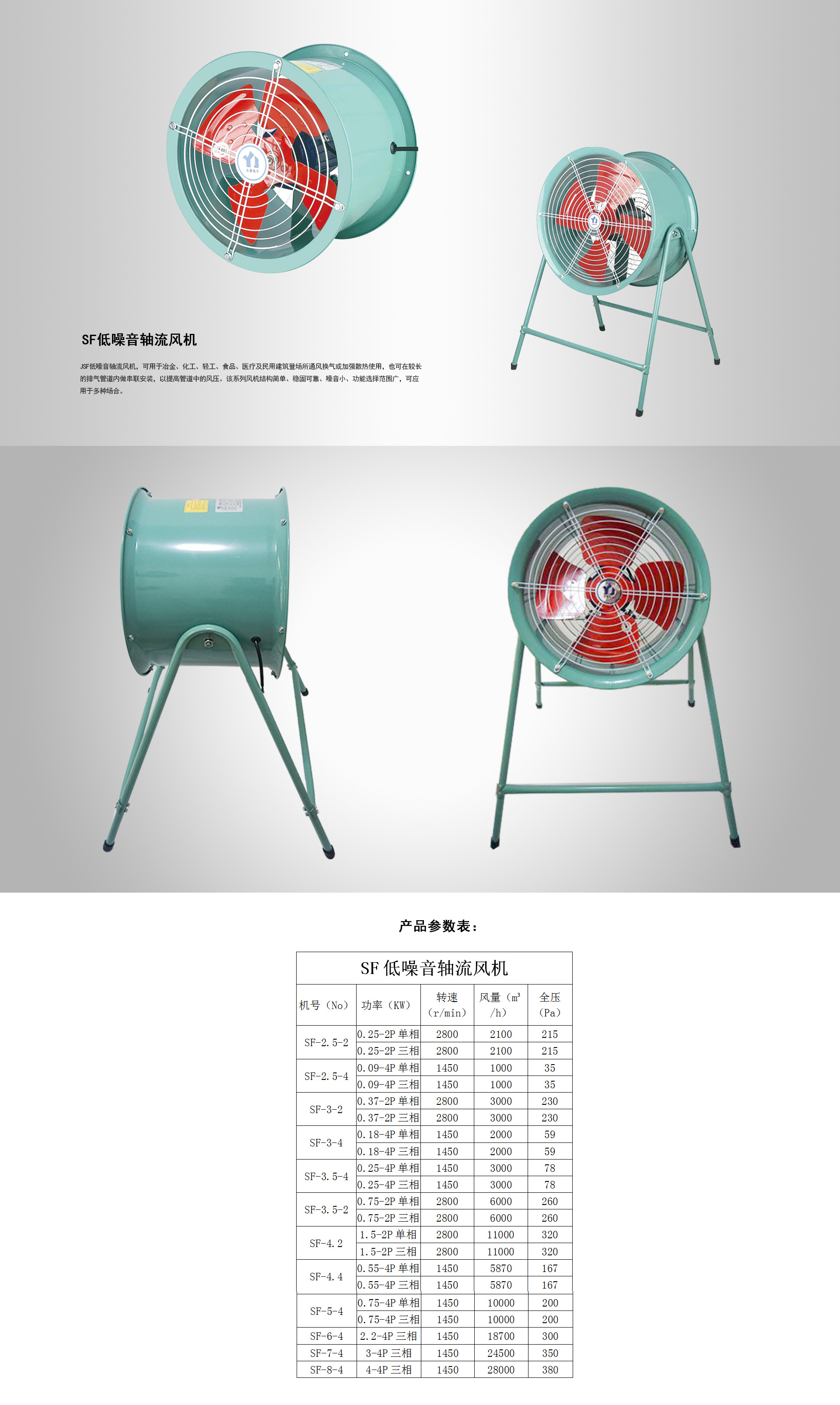 ? ? ? ? SF低噪音軸流風機,可用于冶金、化工、輕工、食品、醫療及民用建筑登場所通風換氣或加強散熱使用,也可在較長的排氣管道內做串聯安裝,以提高管道中的風壓。該系列風機結構簡單、穩固可靠、噪音小、功能選擇范圍廣,可應用于多種場合。