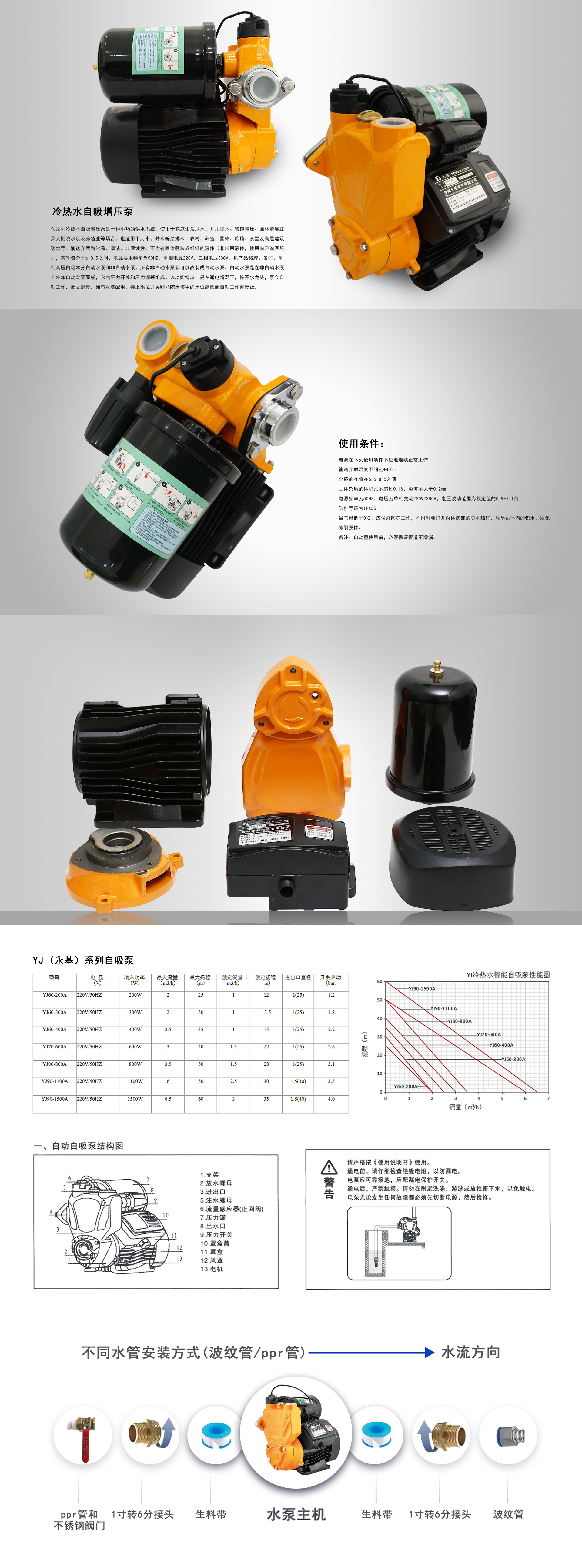 ? ? ? ? ?YJ系列冷熱水自吸增壓泵是一種小巧的供水系統,使用于家庭生活取水、井用提水、管道增壓、園林澆灌蔬菜大棚澆水以及養殖業等場合。也適用于河水、井水等給排水、農村、養殖、園林、旅館、食堂及高層建筑送水等。輸送介質為常溫、清潔、非腐蝕性、不含有固體顆粒或纖維的液體(非常用液體,使用前咨詢客服),其PH值介于6-8.5之間;電源要求頻率為50HZ,單相電源220V,三相電壓380V,見產品銘牌。備注:單相高壓自吸本分自動水泵和非自動水泵。所有非自動水泵都可以改裝成自動水泵。自動水泵是在非自動水泵上外加自動裝置而成,它由壓力開關和壓力罐等組成。該功能特點:是在通電情況下,擰開水龍頭,泵會自動工作,反之則停。如與水塔配用,接上限位開關則能隨水塔中的水位高低而自動工作或停止。